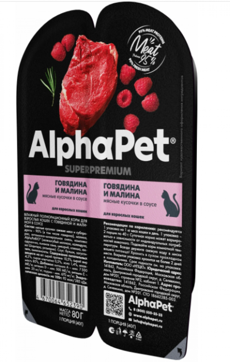Ингредиенты: Мясные кусочки: свежее мясо и субпродукты - 90% (в том числе говядина), малина, рис, витаминно-минеральная смесь, комплекс AlphaPetBIO (зеленогубый моллюск, календула, одуванчик, льняное семя, цикорий, клюква, юкка Шидигера, розмарин).