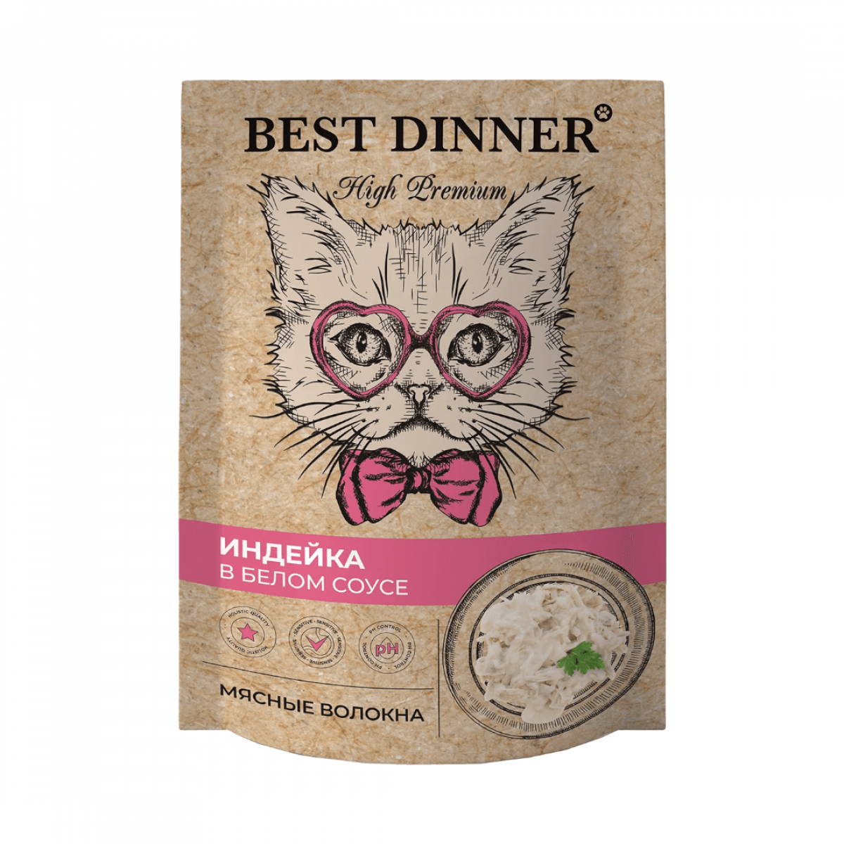 Влажный корм Best Dinner High Premium содержит натуральное мясо индейки высшего сорта (филе грудки). Без субпродуктов, с добавлением молочных сливок, а также пшеничной муки в качестве загустителя, подсолнечного масла - источника витамина Е, рыбьего жира - источника витаминов А и Д, дрожжей – источника витамина В и таурина.