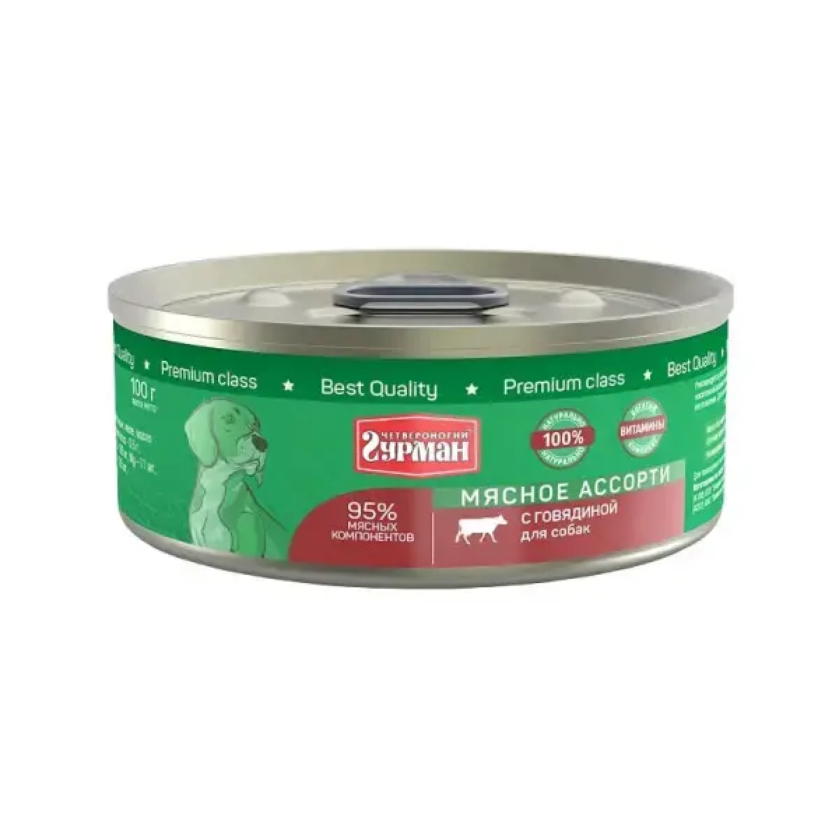 Четвероногий Гурман Мясное ассорти с говядиной для собак - мясной консервированный корм суперпремиум класса. Состоит исключительно из натуральных ингредиентов. Корм не содержит злаков, овощей и бобовых. В составе несколько видов мяса, качественные мясные субпродукты, растительное масло и каррагинан (натуральный компонент, получаемый из морских водорослей).