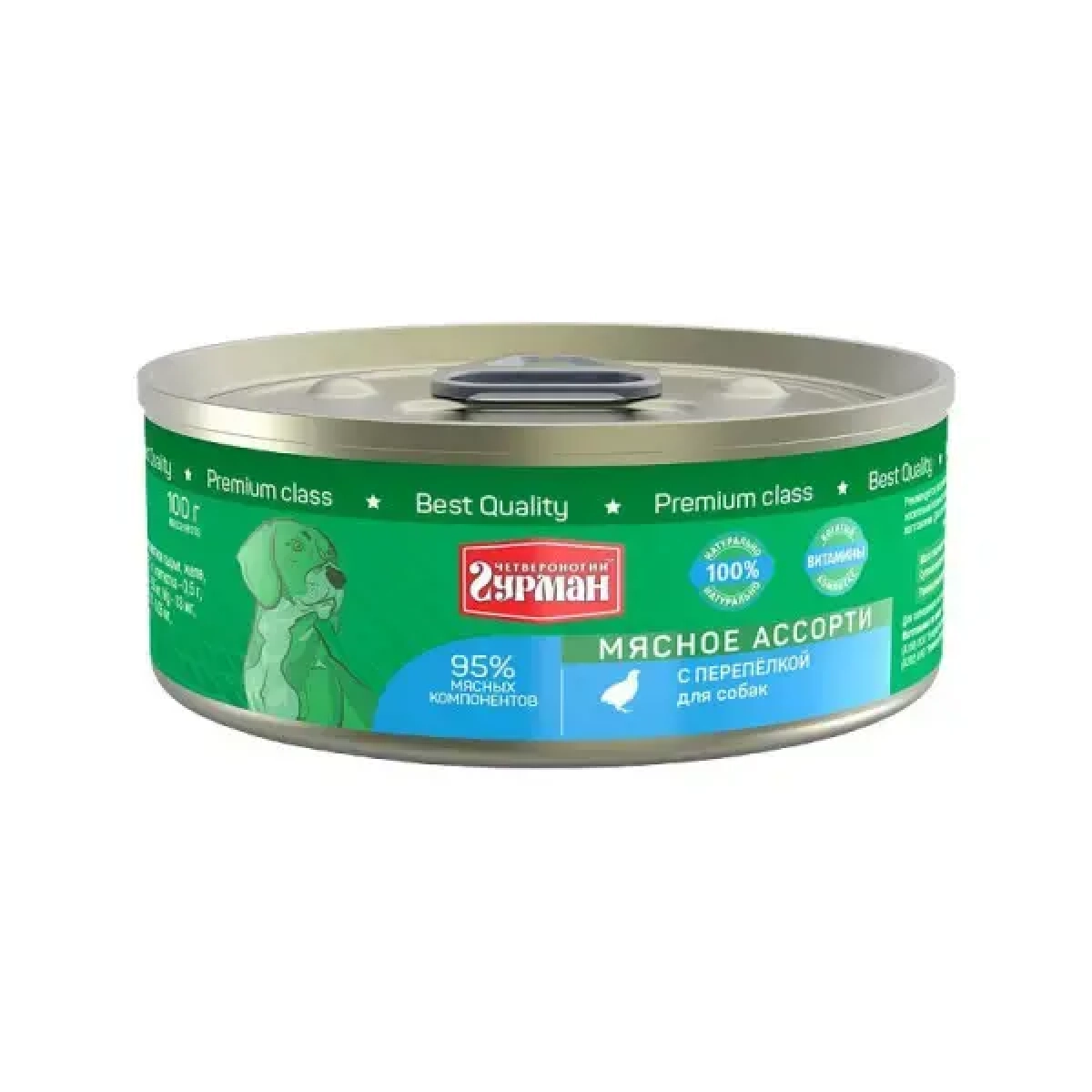 Четвероногий Гурман Мясное ассорти с перепелкой для собак - мясной консервированный корм суперпремиум класса. Состоит исключительно из натуральных ингредиентов. Корм не содержит злаков, овощей и бобовых. В составе несколько видов мяса, качественные мясные субпродукты, растительное масло и каррагинан (натуральный компонент, получаемый из морских водорослей).