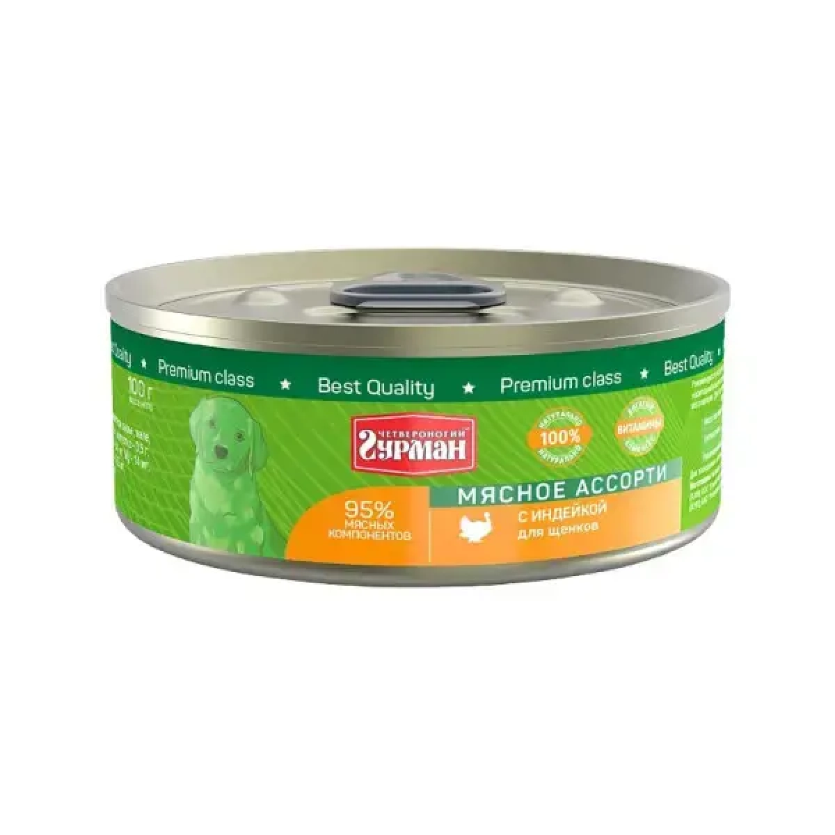 Четвероногий Гурман Мясное ассорти с индейкой для щенков - мясной консервированный корм суперпремиум класса. Состоит исключительно из натуральных ингредиентов. Корм не содержит злаков, овощей и бобовых. В составе несколько видов мяса, качественные мясные субпродукты, растительное масло и каррагинан (натуральный компонент, получаемый из морских водорослей).