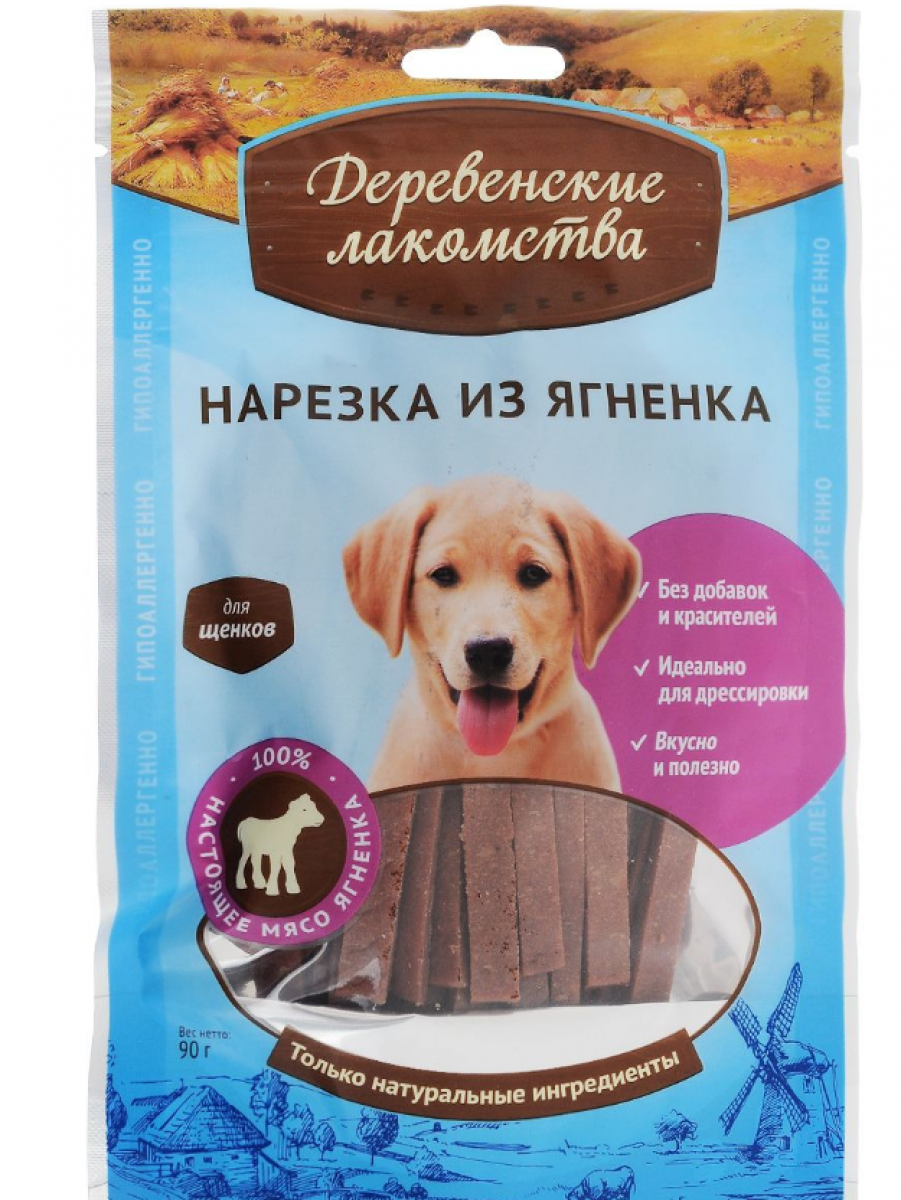 Деревенские лакомства Нарезка из ягненка для щенков - нежные полоски отборного мяса ягненка, легко ломаются на маленькие кусочки и отлично подходят для поощрения щенков на первых дрессировках и корректировке поведения.