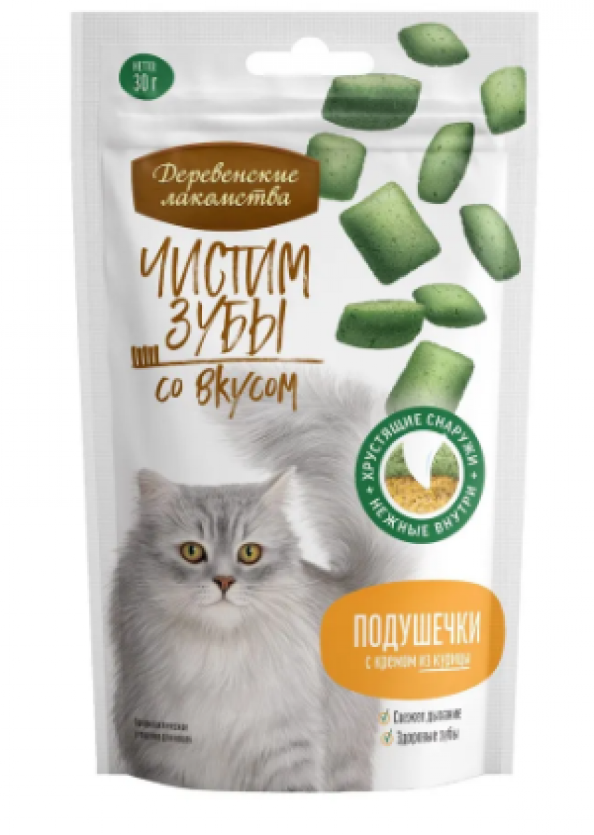 Деревенские лакомства "Чистим зубы" для кошек Подушечки с кремом из курицы 30гр