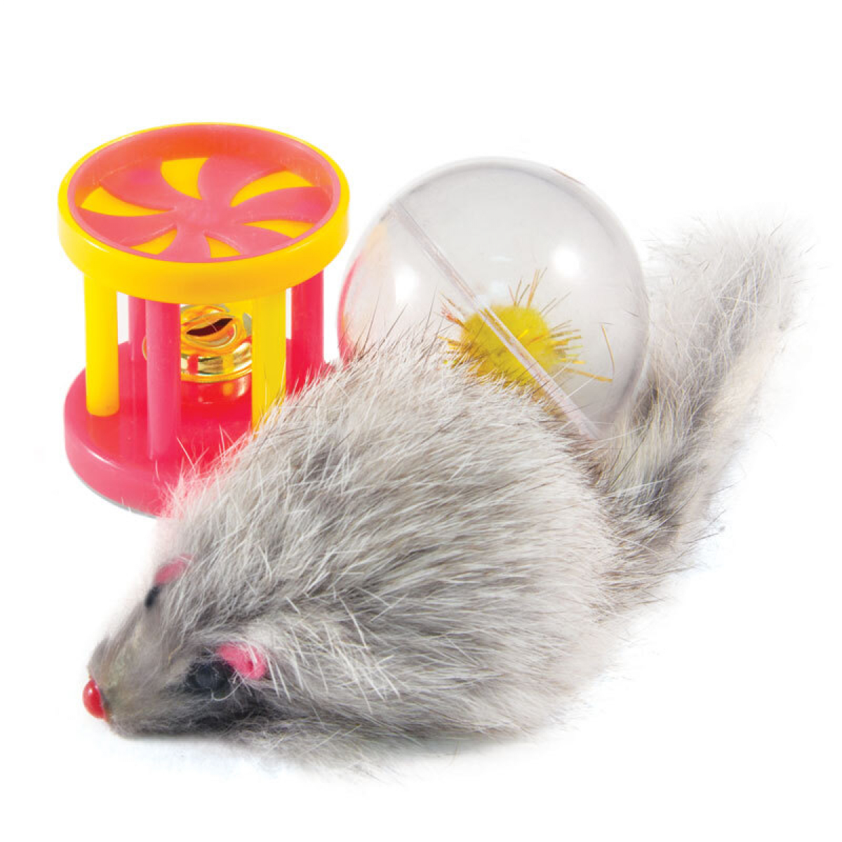Этот набор из трех ярких игрушек - отличный вариант для активной и разнообразной игры с пушистыми питомцами. В комплект входят: мышь меховая (d25х55/105мм); мяч из пластика с погремушкой внутри (d45мм); барабанчик с колокольчиком внутри (d41х40мм). С такими игрушками маленькие котята хорошо развиваются, а взрослые животные - держат себя в тонусе и оттачивают охотничьи навыки. Набор упакован в прозрачный пакет в клапаном.