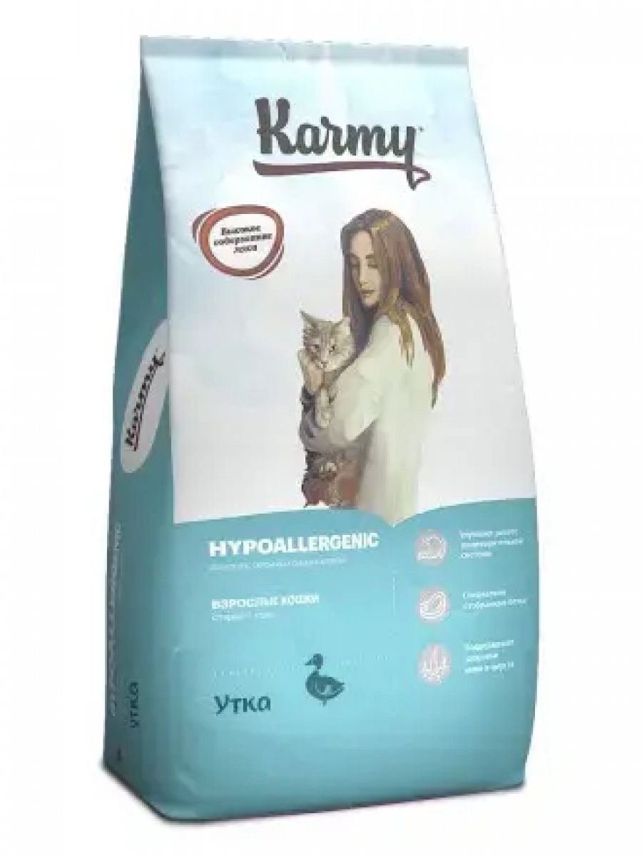 Karmy Hipoallergenic – сухой корм для взрослых кошек, поддерживающий здоровье кожи и шерсти.