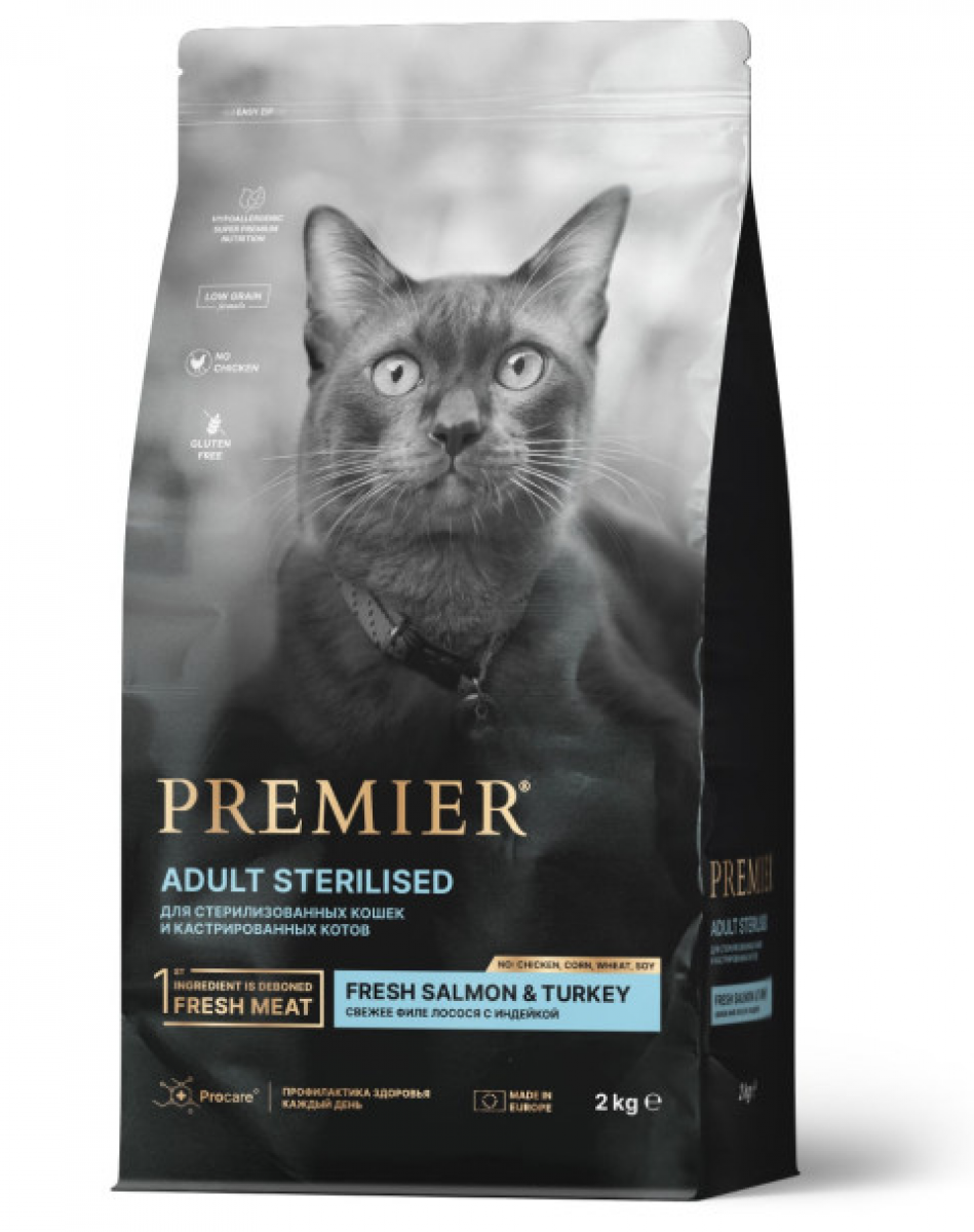 Сухой корм Premier Cat Salmon & Turkey Sterilised (Премьер Стерилайзд) для взрослых стерилизованных кошек и кастрированных котов от 1 года с чувствительной кожей и шерстью или склонных к аллергии или пожилых кошек.