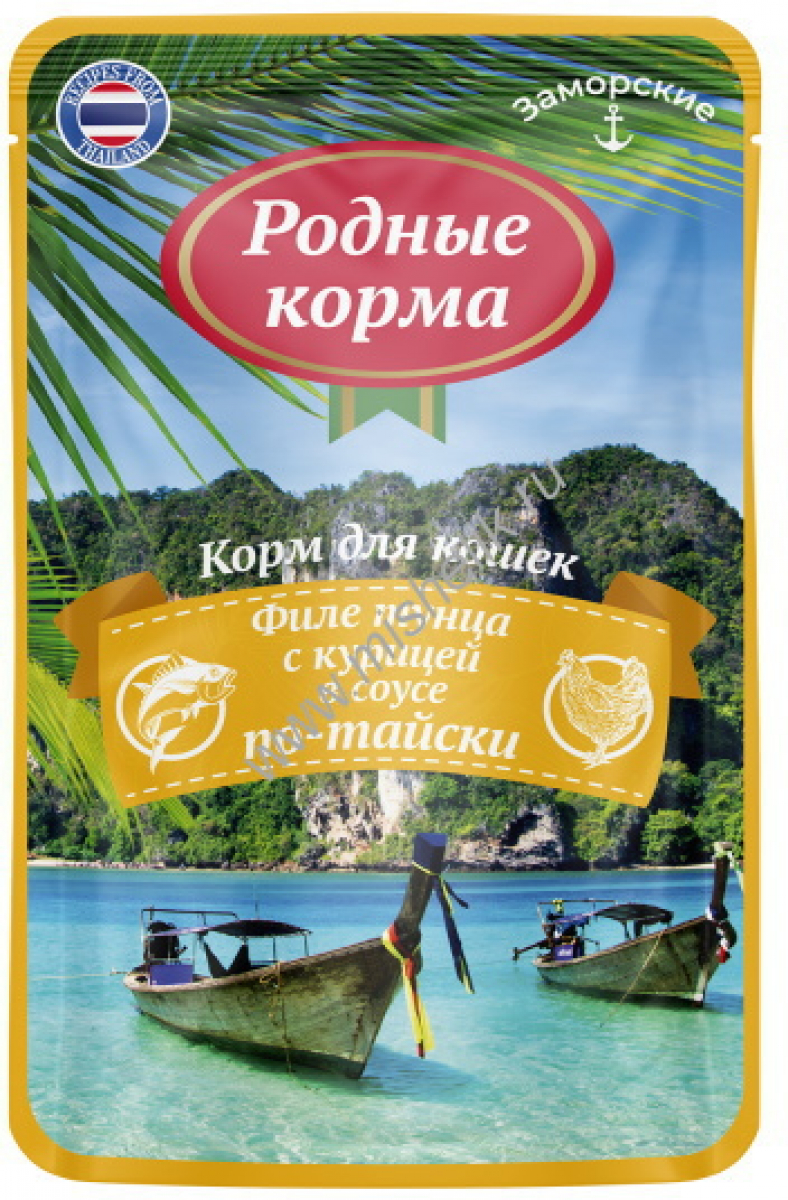 Родные корма Заморские влажный корм для кошек филе тунца с курицей в соусе по-тайски 70 г