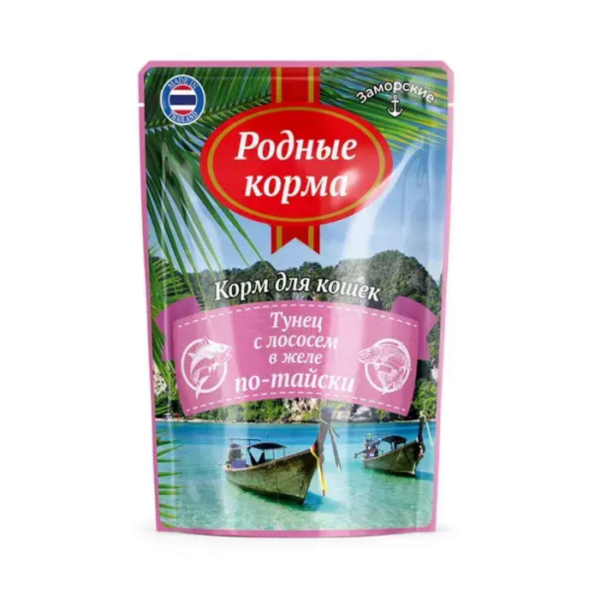 Заморские паучи для кошек тунец с лососем в желе по-тайски. Тунец - одно из самых любимых и привлекательных лакомств для кошек, помимо вкуса, тунец невероятно полезен, в нем содержится много витаминов и минералов, которые помогают укреплять иммунитет и улучшают состояние кожи и шерсти любимца. А добавление лосося дополнительно обогащает корм аминокислотами, омега-3 и омега-6 жирными кислотами. Корм высокоусвояем и содержит много белка, а притягательная консистенция в желе не оставит кошку равнодушной!