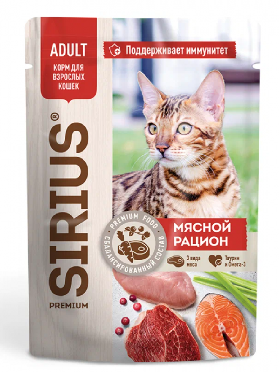 SIRIUS – влажный корм премиум-класса для полноценного ежедневного рациона взрослых кошек.