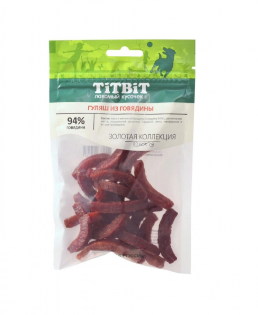 Золотая коллекция – это линейка лучших лакомств TiTBiT, разработанных при участии владельцев домашних животных и их питомцев. Гуляш из говядины - это мясной деликатес, который, благодаря высокому содержанию мяса (94 %) и бережной технологии приготовления, имеет привлекательный внешний вид, невероятный вкус и нежную текстуру. Говядина, входящая в основу лакомства, обогащает организм высококачественным животным белком и аминокислотами. Ни один гурман не сможет устоять перед таким деликатесом.