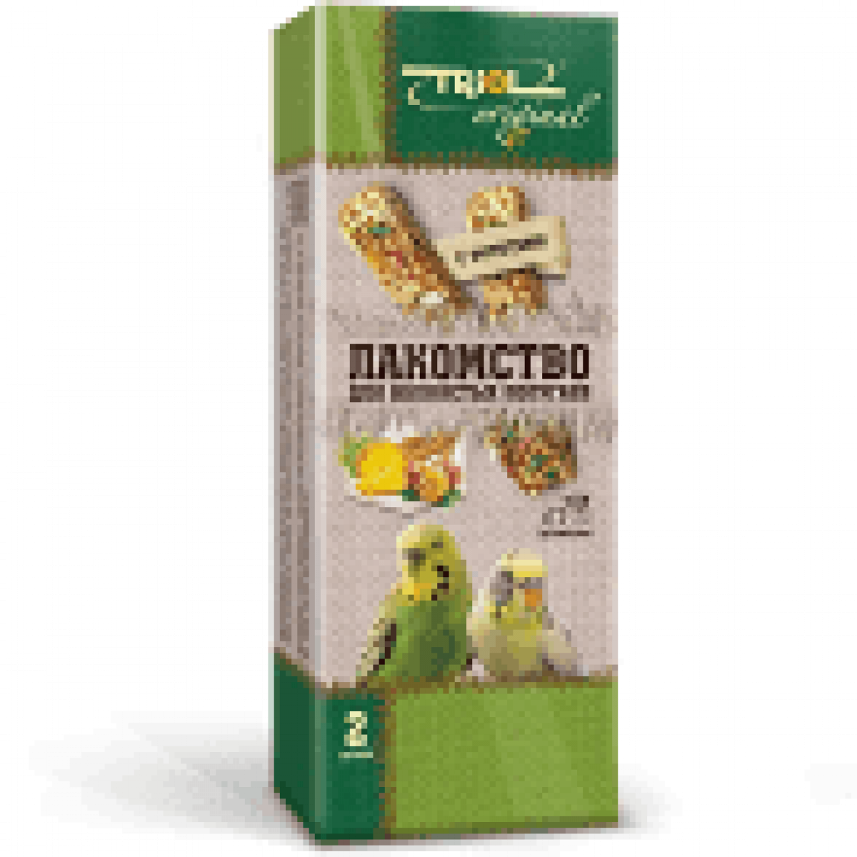 Лакомство для волнистых попугаев с фруктами: две палочки лакомства запаяны в полиэтиленовый пакет и уложены в картонную коробочку.