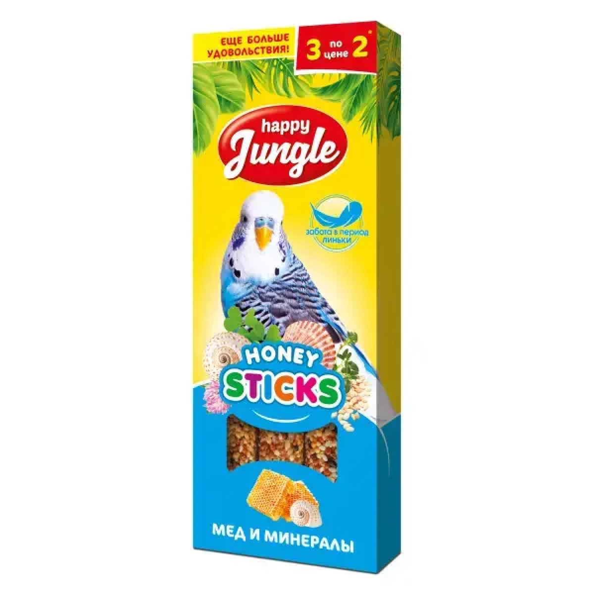 Зерновые палочки Happy Jungle - специальное медовое лакомство для волнистых и средних попугаев в период линьки с кунжутом и ракушечником.