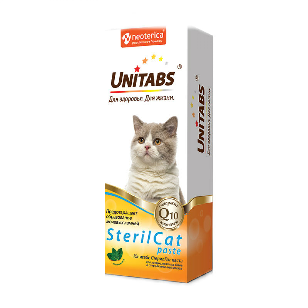 Unitabs SterilCat — это витаминно-минеральный комплекс для кастрированных котов и стерилизованных кошек, который содержит коэнзим Q10 и все необходимые витамины, макро- и микроэлементы.