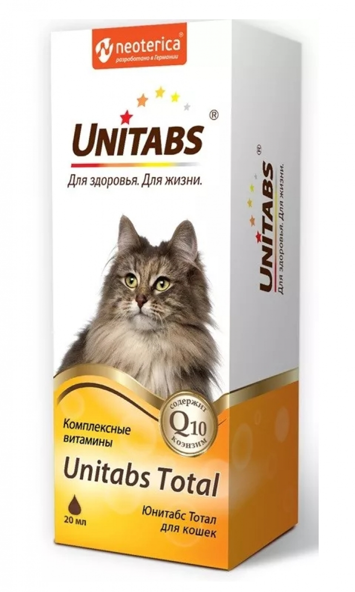 Юнитабс Тотал — это витаминный комплекс для кошек любых пород, который содержит коэнзим Q10 и все необходимые витамины для улучшения состояния кожи, шерсти, иммунитета питомца.